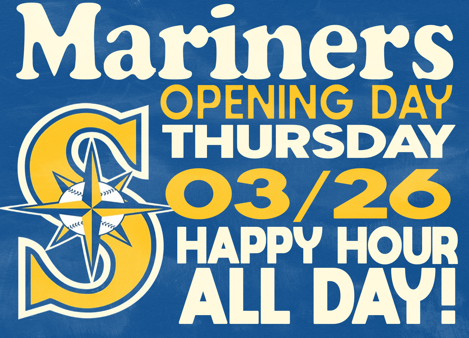 To celebrate the start of our favorite sports season...Go M's! Happy hour all day + surround sound. Now accepting reservations of any size - pre game, viewing party, post game!